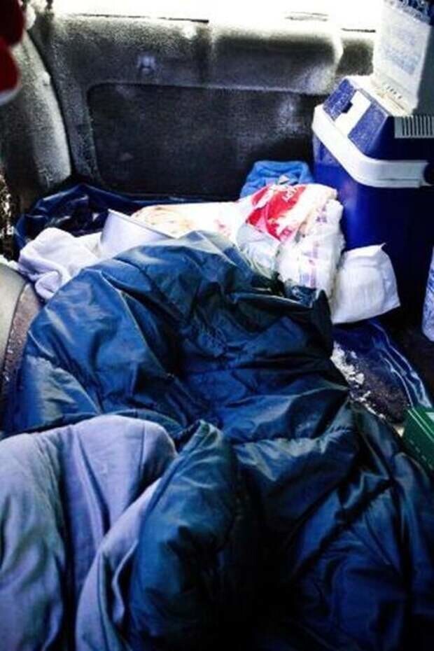 The car has run out of fuel. And Peter tried to maintain warmth with the help of a heater and a sleeping bag.