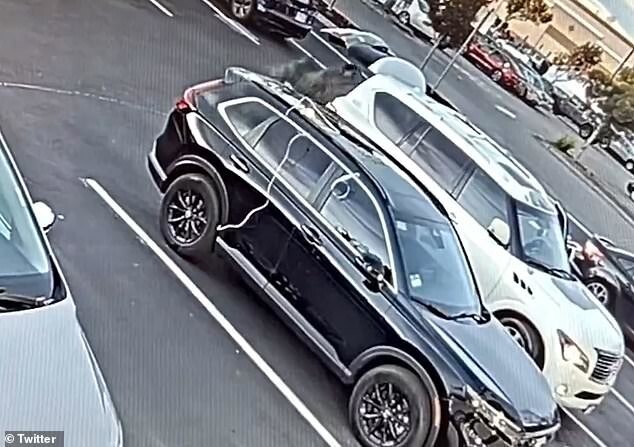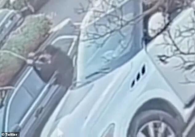 The thief parked next to a black SUV, quickly cut the ropes and placed the tree in his white Infiniti.