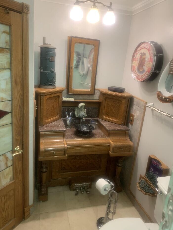 14. Music room. The water is turned on by pressing the pedals; the piano was made in 1910. Clarinet for towel and trombone holds toilet paper