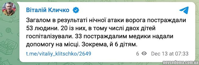 - Dnieper district: a rocket fell on the territory of a hospital (important: the KMVA writes about the destruction of all targets. Klitschko probably meant the impact of debris). Partial destruction of private houses.