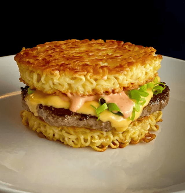 This type of burger replaces the traditional sesame bun with fried ramen noodles.