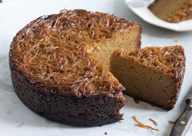 This is a savory casserole made with thin boiled noodles coated in caramelized sugar. For this dish, they do not spare black pepper.