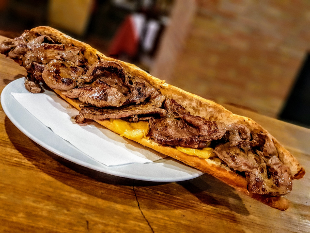The baguette is cut in half and filled with pieces of fried or grilled horse meat. This dish is usually served with a glass of cold beer or red wine, a cup of coffee, olives and peanuts.