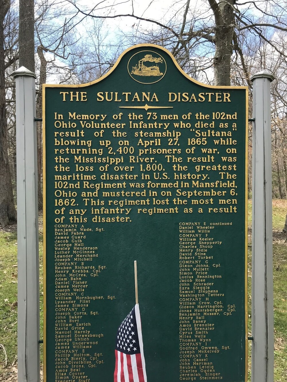 Memorial plaque in memory of those killed on the Sultana. Mansfield, Ohio today