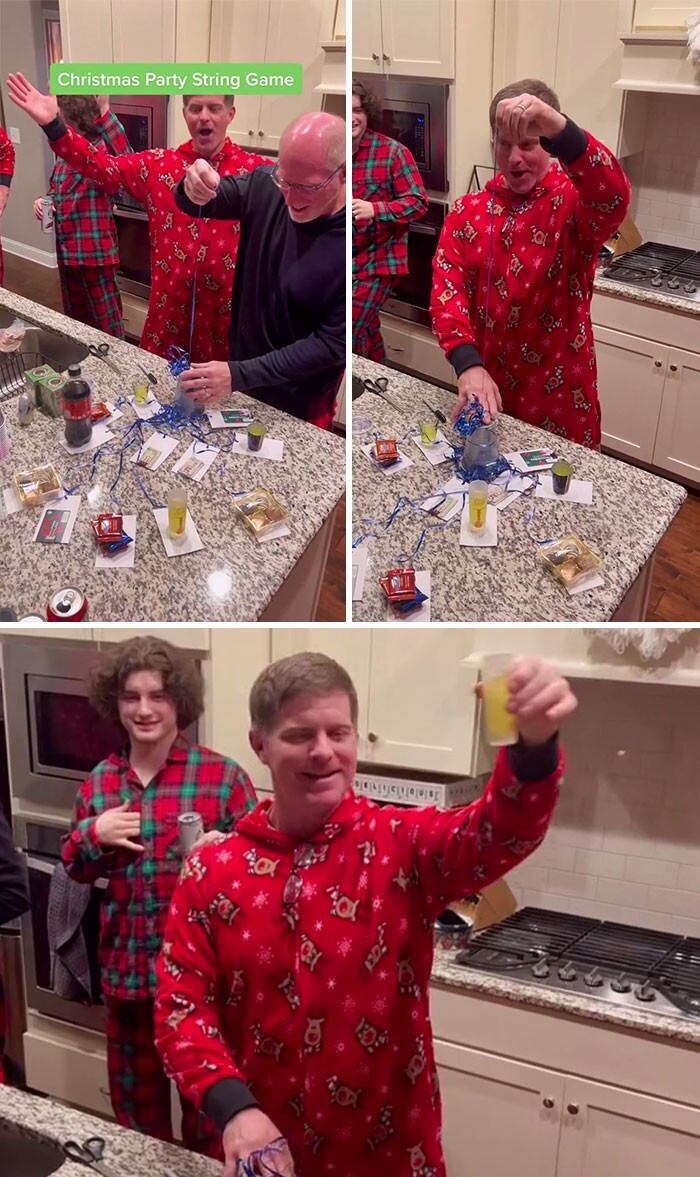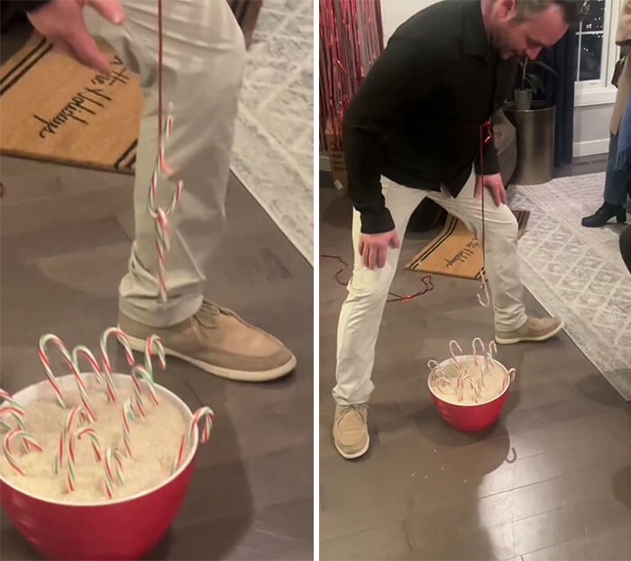 A candy cane on a string is tied to the stomach, then the player must use such a hook to catch as many candies as possible from the bowl. Time is, of course, limited.