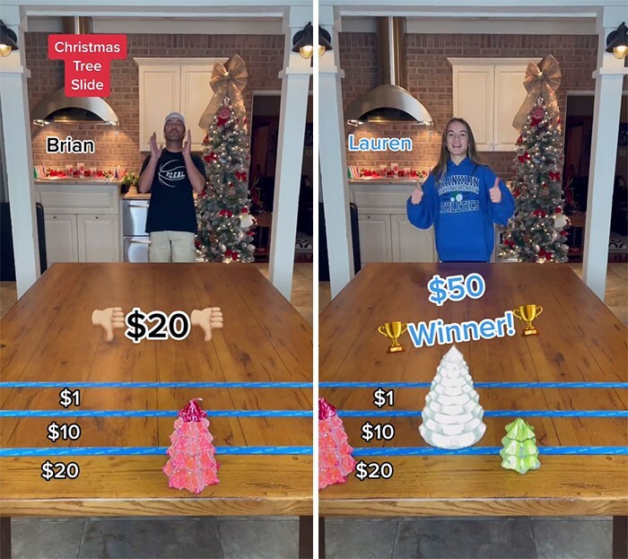The goal of the competition is to launch the Christmas tree so that it does not fall off the table and stops on the line with the highest prize.