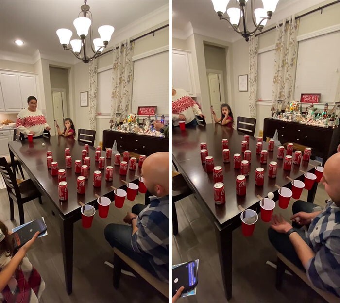 For this entertainment you will need a medium-sized box and five pairs of objects of different shapes. This family used glasses. The participant must remember the sequence of figures and place the row correctly.