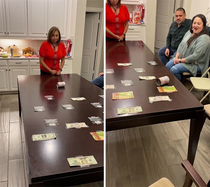 There are many ribbons tied to the cup, each of which leads to a gift. Participants pull the end of the ribbon and receive their prize.