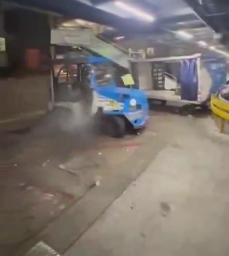 The Boeing 737-700's wing hit the passenger ramp and brought it down. The ramp drifted towards the cars of the runway workers.