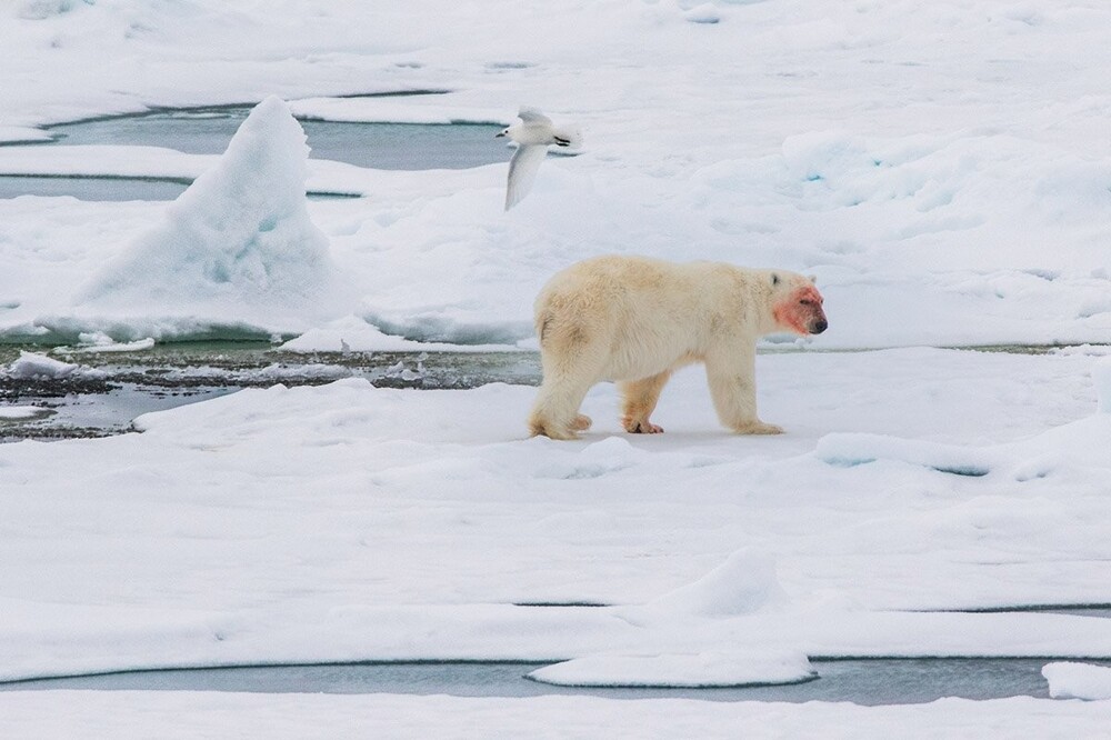 Lack of food in winter leads to the fact that male polar bears (Ursus maritimus) have to eat females and cubs. According to a 2011 study published in the journal Arctic, both males and females hunt the carcasses of dead polar bears that have been skinned by humans.