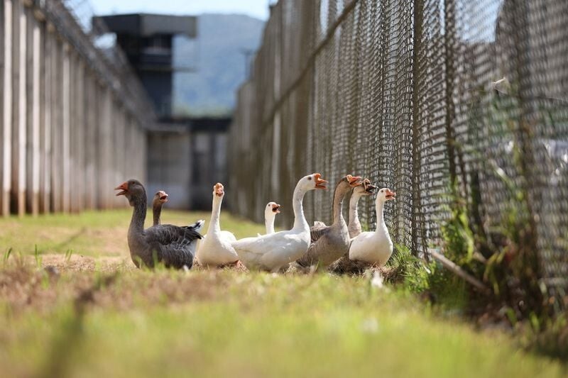 A small flock is led by a leader with the formidable nickname Piu-Piu. When officers call him by name, he makes a distinctive sound. Warden Souza stressed that keeping geese is more economical than keeping dogs, and the prison's location in a quiet area makes the use of birds a viable alternative for their establishment.