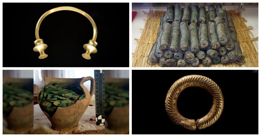 A landslide in northern Spain led to the discovery of two gold necklaces that were buried around 2,500 years ago.t back. The first of the C-shaped necklaces, known as torcs, was discovered by a utility worker, and the second by a treasure hunter using a metal detector. Judging by the style and technique of the jewelry, archaeologists have concluded that the necklaces were made around 500 BC, during the Iron Age in Iberia, and were most likely worn by members of the upper class.