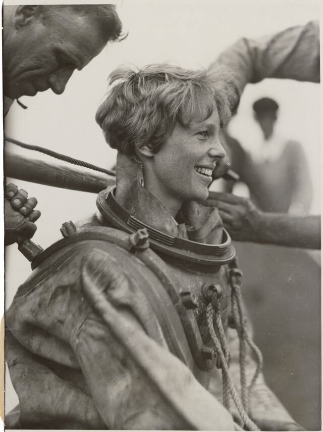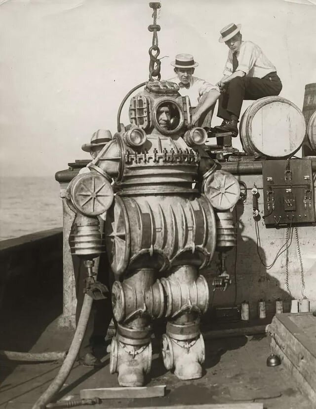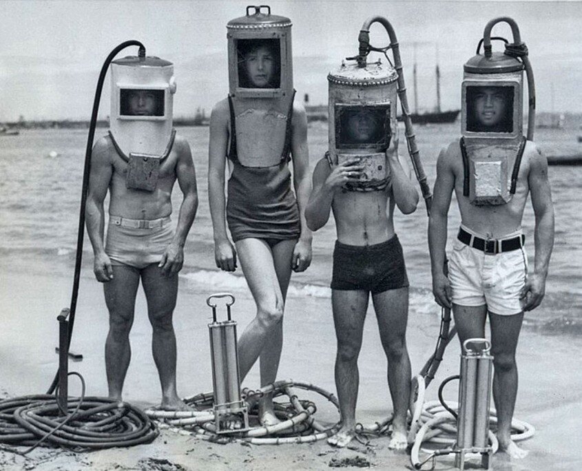 It is also impossible not to notice that not only men, but also women have long been engaged in such a dangerous profession. In the photo above, Amelia Earhart is helped to remove her spacesuit after exploring the seabed off Block Island, July 25, 1929. In general, she became the first female pilot to fly over the Atlantic Ocean, but, as you can see, she did not disdain diving either.
