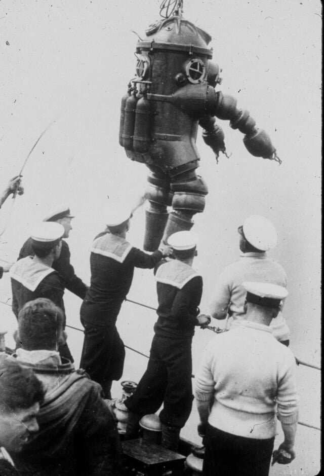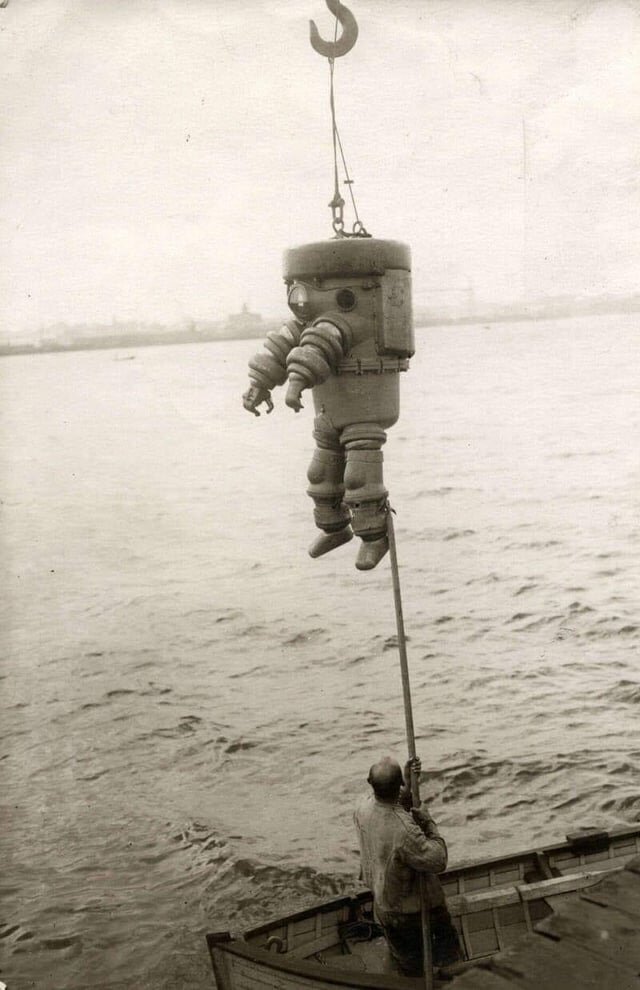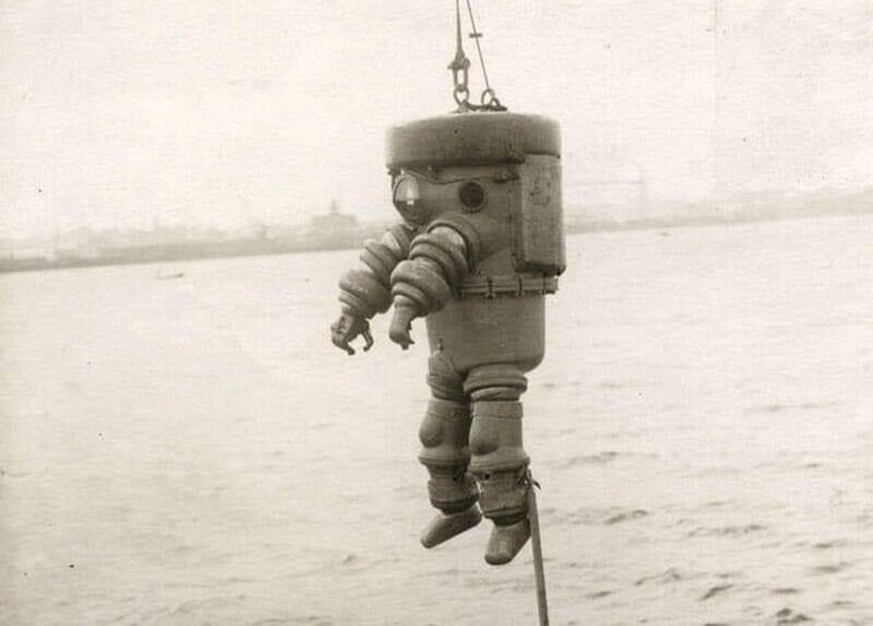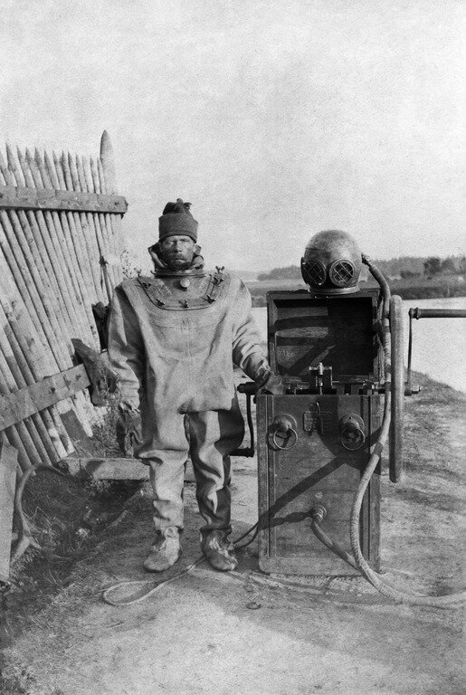 The photo is also early, but it is clearly visible that this is already a classic diving suit: a metal helmet with portholes, bolted to the shoulders and connected through a hose to an air source on the surface and a heavy suit for protection from cold water.