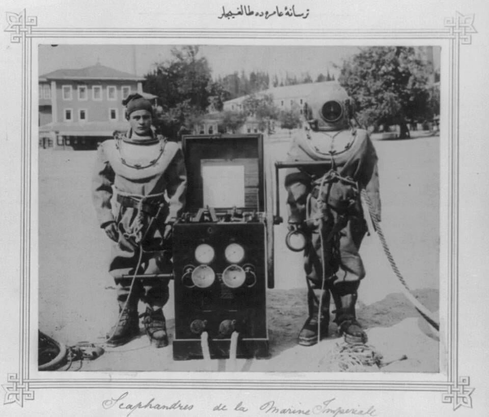 Divers at the Imperial Naval Arsenal (the main base and naval dockyard of the Ottoman Empire). Between them, as I understand it, is a manual pump for supplying air, but already equipped with pressure gauges for control.