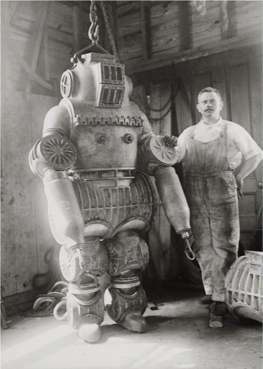 The Iron Man of the past in the latest diving suit at that time. The suit, by the way, was called “Iron Man.” It already had an overpressure protection system, as well as power supply (see the headlights?). New York, 1907.