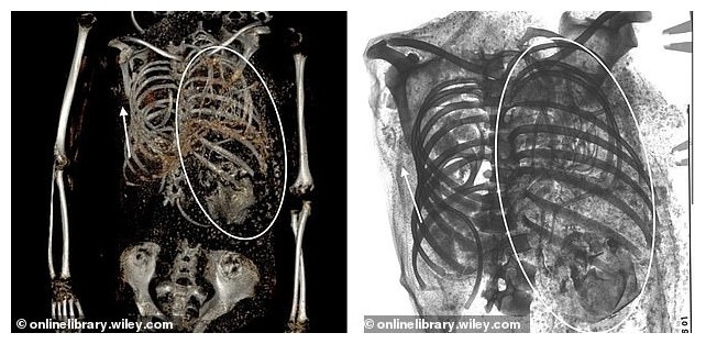 How the second fetus migrated into the chest cavity is still unclear. It may have been mummified along with other internal organs. During the mummification process, the diaphragm and connective tissue in this area may have resorbed, allowing the unborn baby to move into the chest cavity.