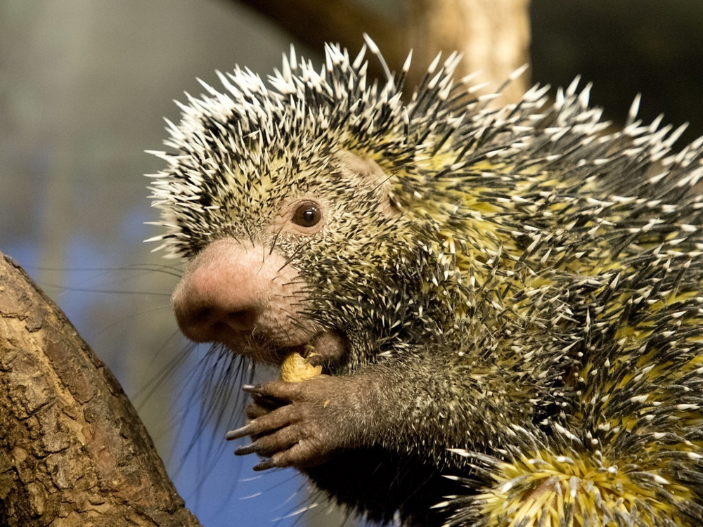 Well, if you look at the two-colored porcupines more closely, you can notice, in addition to the quills, a very unusual detail - a long, thick and semi-bald tail. It looks like a porcupine's fifth leg, and is used in much the same way: animals spend most of their lives in trees, where an extra limb comes in very handy. With the help of a semi-prehensile tail and long claws on their paws, the animals are excellent at climbing branches and getting food from the very tops - fruits, seeds, leaves and other green stuff.