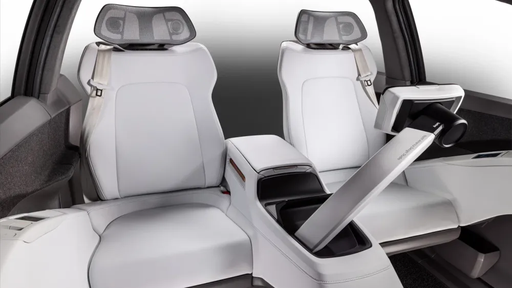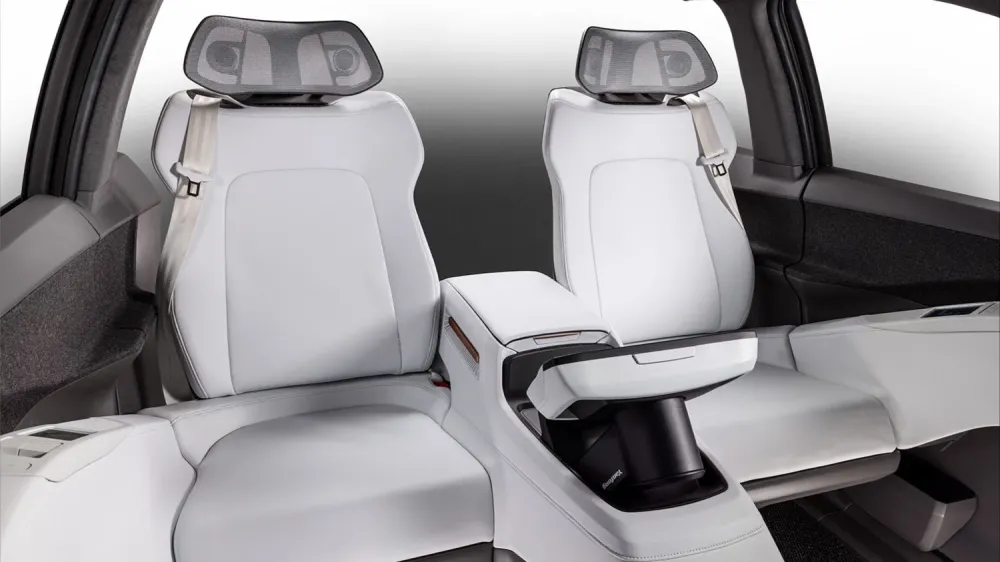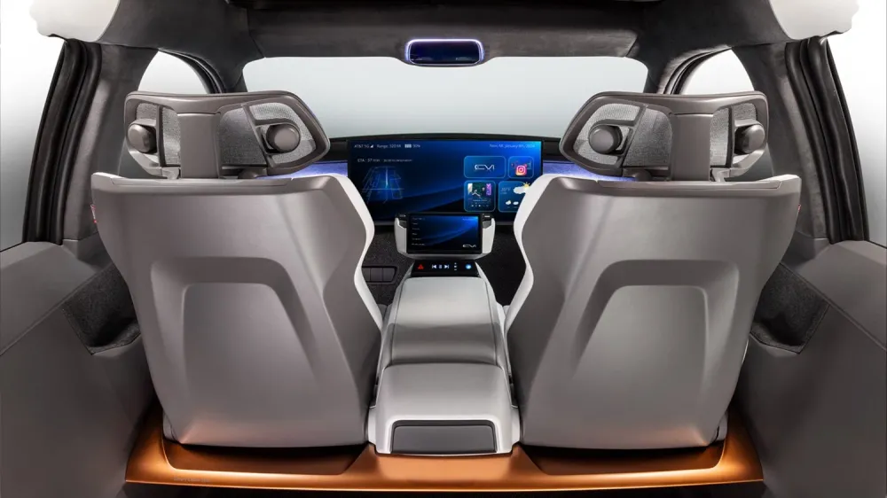 Yanfeng EVI is devoid of traditional instruments, although it retains a large central screen. It is complemented by a separate touch panel for controlling all functions - it is installed on a massive console separating the seats. The console contains hidden compartments for storing small items and charging gadgets. The seats themselves received mesh headrests with built-in speakers.