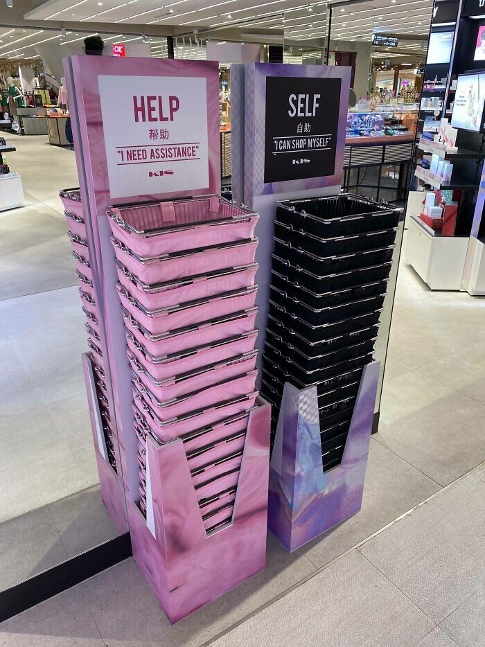 22. These two different sets of shopping baskets at a department store in Bangkok are for those who need help and those who want to be left alone