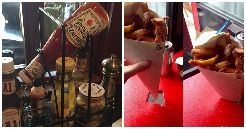 13. French fries in this restaurant are served in a paper cone that fits neatly into a hole in the table.