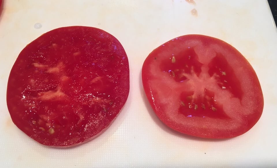 1. On the left is a tomato grown on my grandmother's farm; on the right - bought in a store