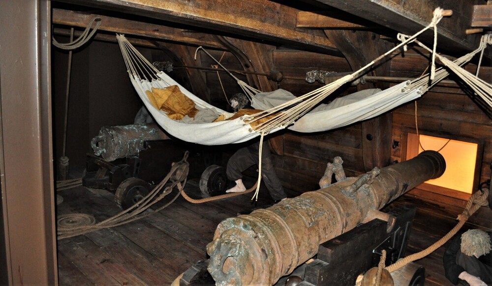 The canvas hammock wrapped itself around the sleeper like a cocoon, making it almost impossible to unintentionally fall out of it. The swaying hammock also helped the sailor cope with seasickness and fall asleep more comfortably.