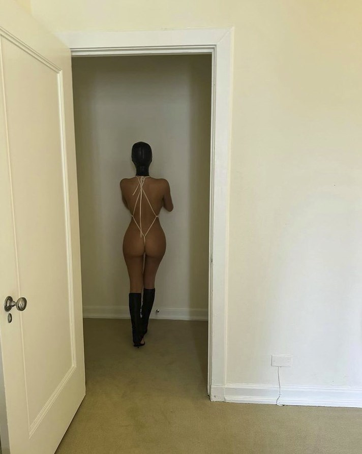 On his page, Kanye West shared photos of home comfort with his subscribers. In them, his housewife wife stands at the stove in a very strange outfit. Bianca is wearing a BDSM-style mask and a swimsuit made of ropes, which covers absolutely nothing on her body.