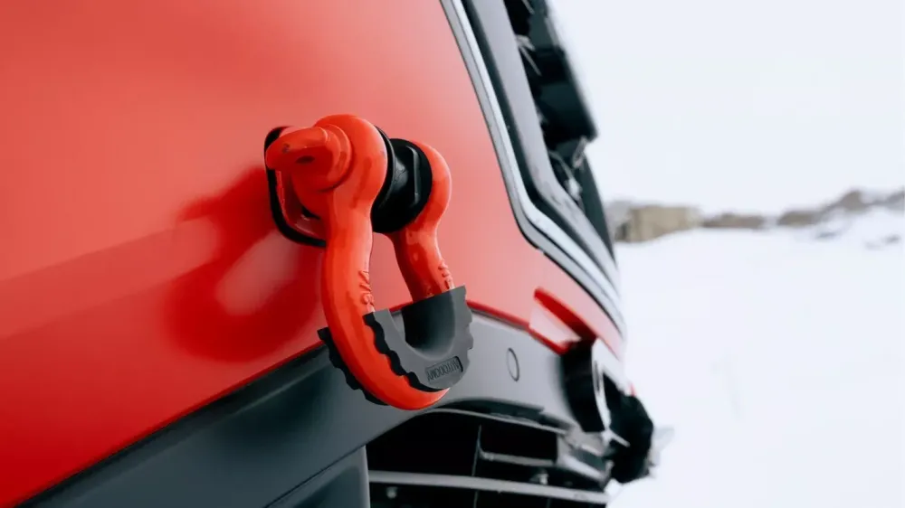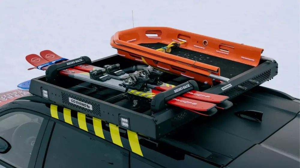 On the outside, the X-Trail was equipped with extended wheel arches, towing eyes, a winch and additional lights. A “chandelier”, evacuation stretcher, skis and snow shovels are attached to the expedition trunk.
