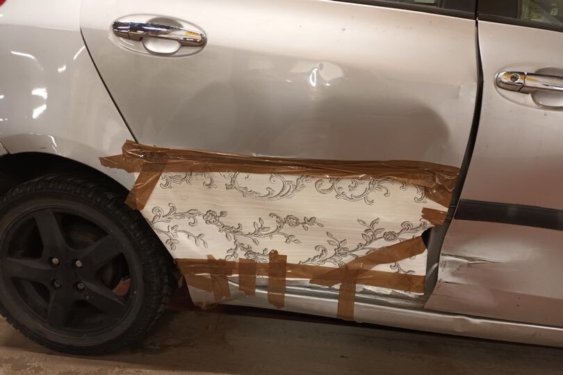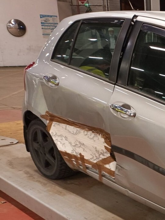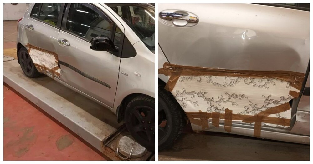 And so it will do: the driver covered a hole in the car with wallpaper (5 photos)