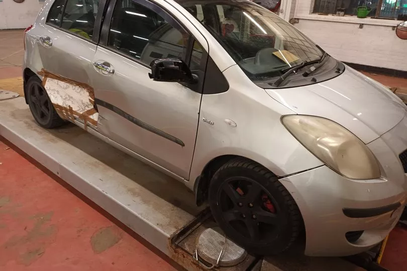 A West Yorkshire Police spokesman said: "The highlight of the evening was this Yaris. Yes, wallpaper and brown duct tape covered the damage sustained in a crash the day before. The DVSA has issued a driving ban on this car. The owner has been cited for driving a vehicle in a dangerous condition."