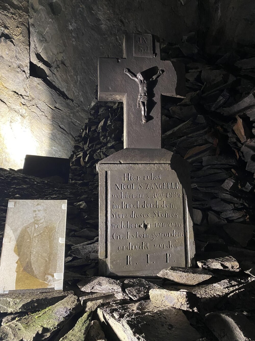 The miner's monument reads: "Here lies Nicholas Zangerle, who was killed on August 2, 1884, by the fall of this stone, which became his tombstone."