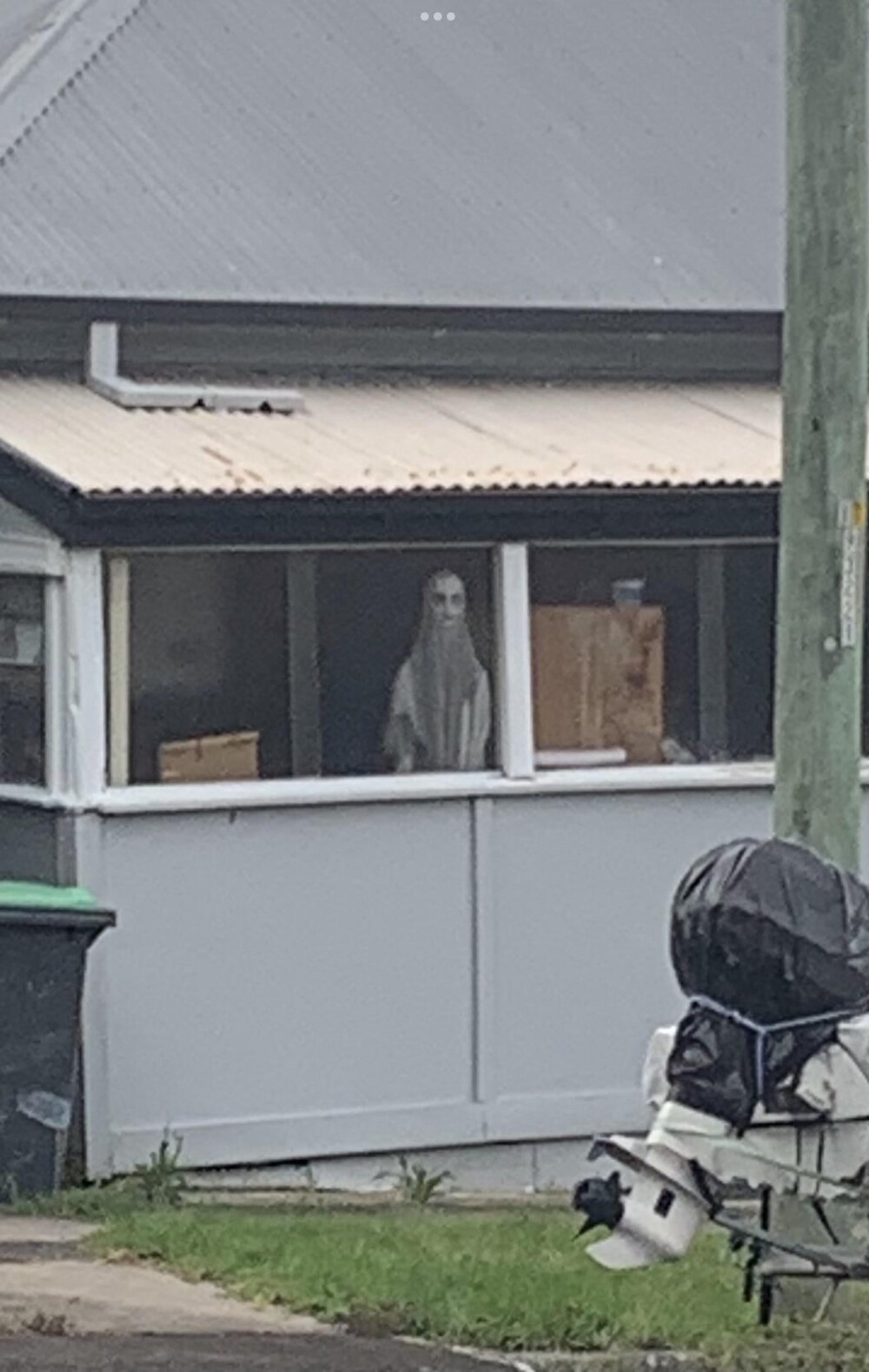 Is it a mannequin or a ghost? He also looks straight into the neighbors’ windows.