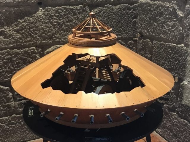 Although this vehicle looks more like an alien ship, it is actually a wooden and metal structure on four wheels with 16 cannons to attack the enemy. Da Vinci's "Tank" remained only a project - he made mistakes in the design that would have rendered it unusable. It was an easy fix, but he never completed the design.