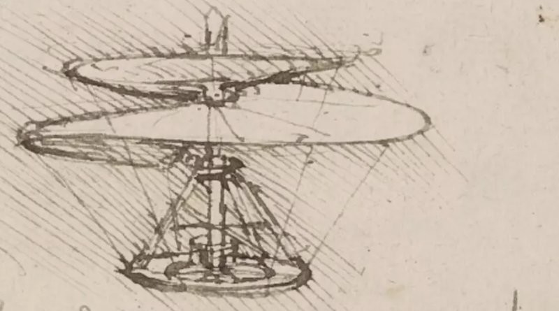 This is an aerial version of the "Archimedes Screw" that Da Vinci created in 1483. As planned, four people had to operate the propeller. However, such a device could not take off due to ill-conceived driving force and weight. But it is believed that this invention became a source of inspiration for the creators of rotary devices.