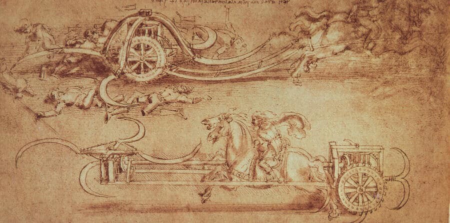 Da Vinci's merciless chariot was called the "chariot of death." It was a cart with two horses, and was equipped with four scythes attached to long beams. As the chariot moved forward, the scythes began to spin, destroying everyone in their path. The disadvantage of the invention is that horses are about they were very afraid of the rotating blades - so it was difficult to control them.