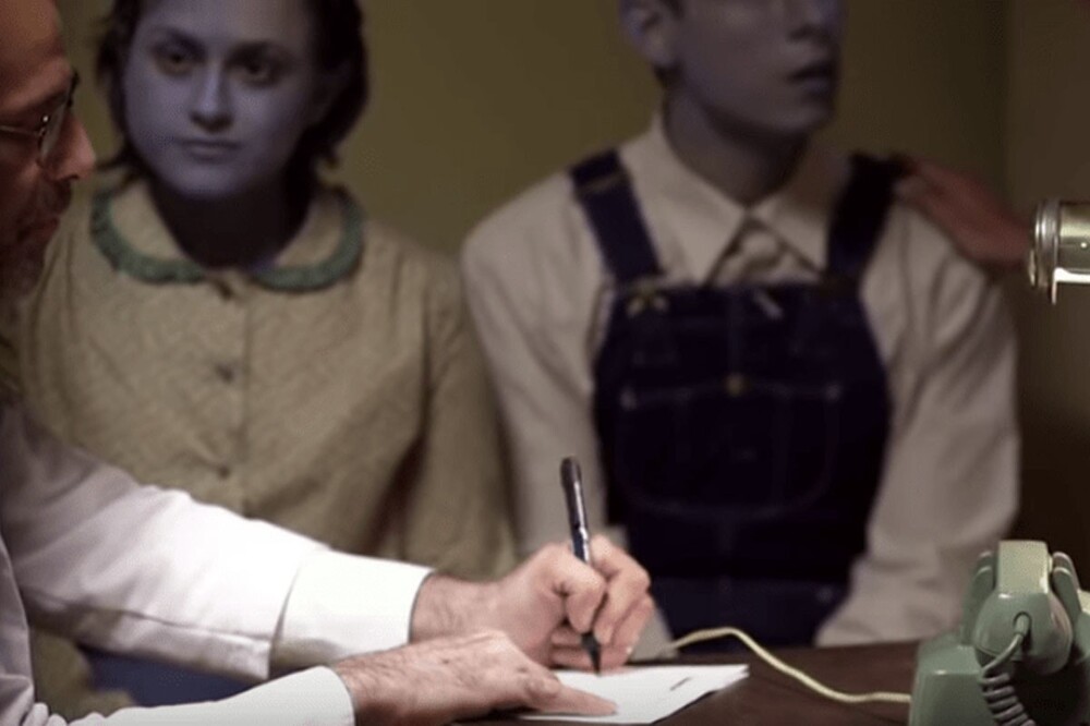 Recreating a conversation between Patrick and Rachel Ritchie - descendants of the Fugates - with Dr. Covin: a screenshot from the television series "Secrets at the Museum"