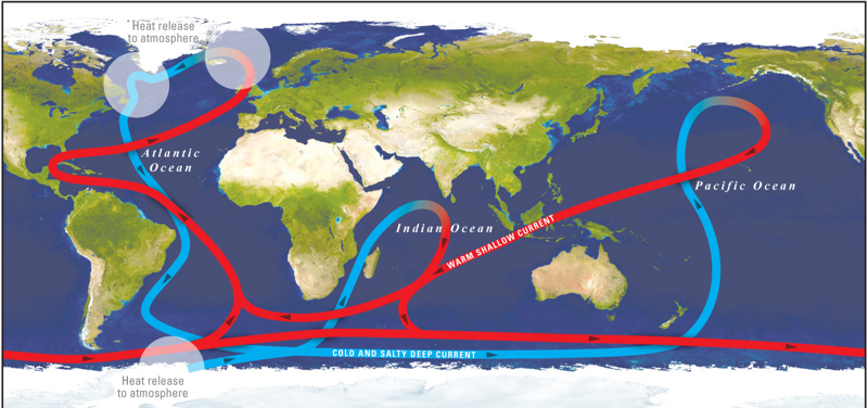 Eventually, the water rises to the surface and heats up in a process called upwelling, completing the cycle.