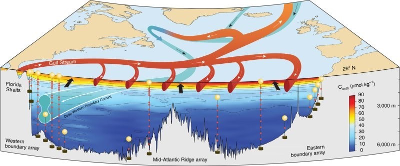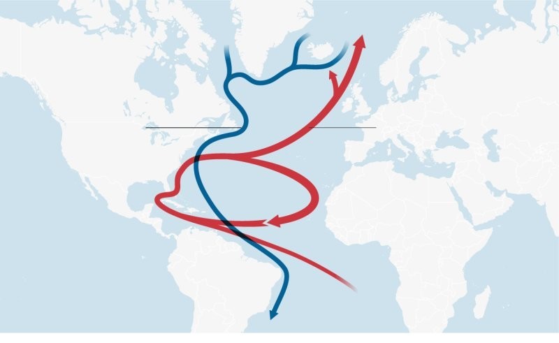 The Gulf Stream is part of a much larger system of currents called the Atlantic Meridional Overturning Circulation (AMOC). It is she who transports warm water at the surface of the ocean to the north - from the tropics to the northern hemisphere.