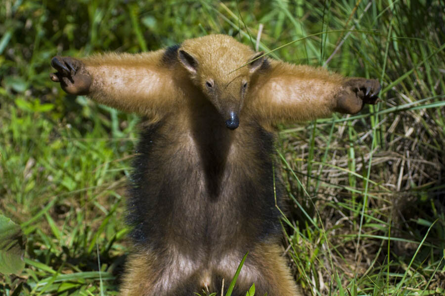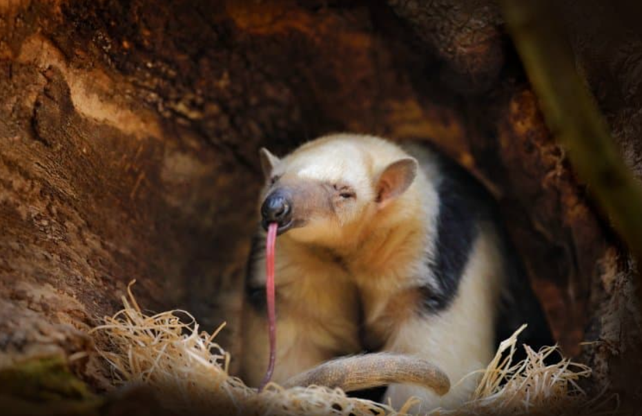 The four-toed anteater (Tamandua tetradactyla) is comfortably in fourth place. Its tongue grows up to 40 cm - this is half of the total length of the entire body! A record ratio among all anteaters. Like any other self-respecting anteater, it feeds on social insects. And not just ants: termites, wasps and bees are also targeted. The beast stirs up the insects' shelters with its powerful front paws, and with its long and sticky tongue it quickly licks off the fire victims of the anthill/termite mound/hive.