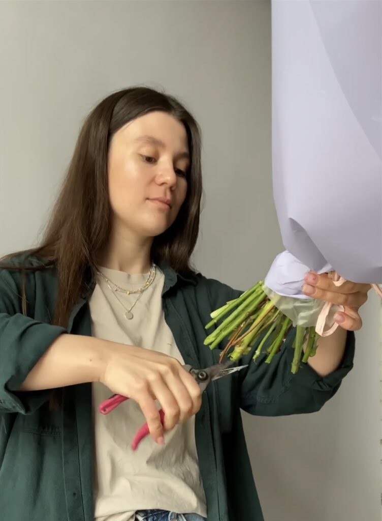 Trim the flowers! This is the main rule that many people forget. After cutting, the flowers continue their life processes and nutrition. When the flower is not in water, it sucks in air, forming an “air plug” that must be cut off and only then placed in water.
