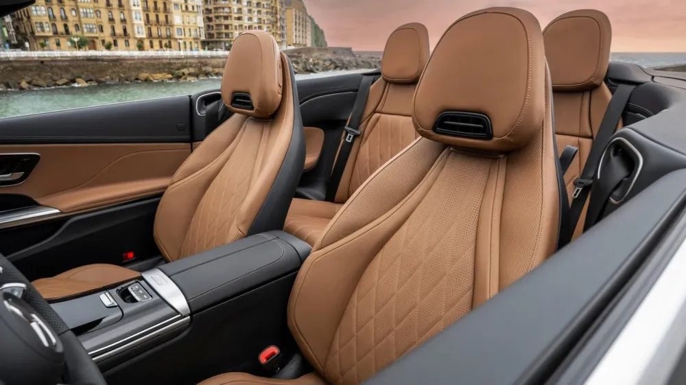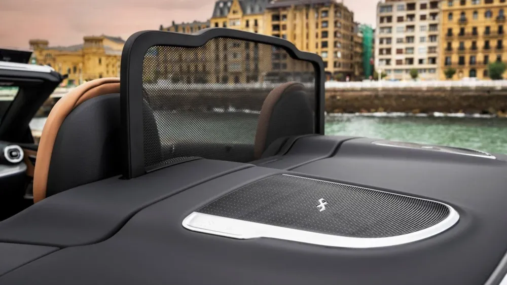 The 11.9-inch diagonal media system screen can change its angle at the driver’s command. Range - from 15 to 40 degrees. This makes it possible to minimize glare on the display when driving with the top open. The leather seat trim is coated with a compound that prevents excessive heating. Four of the 17 speakers of the optional Burmester audio system are located in the front headrests.