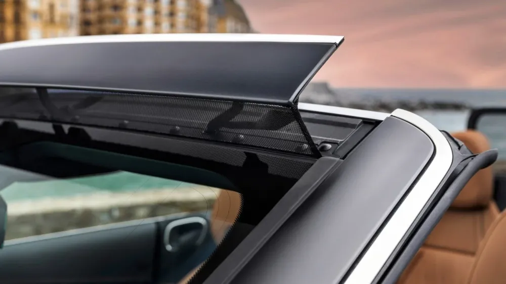 The Aircap system consists of a retractable spoiler above the windshield and a lift-up screen behind the second-row seats. They reduce air turbulence in the cabin. And the Airscarf function is the supply of warm air through the backs of the seats to the neck and shoulders of the driver and right passenger.