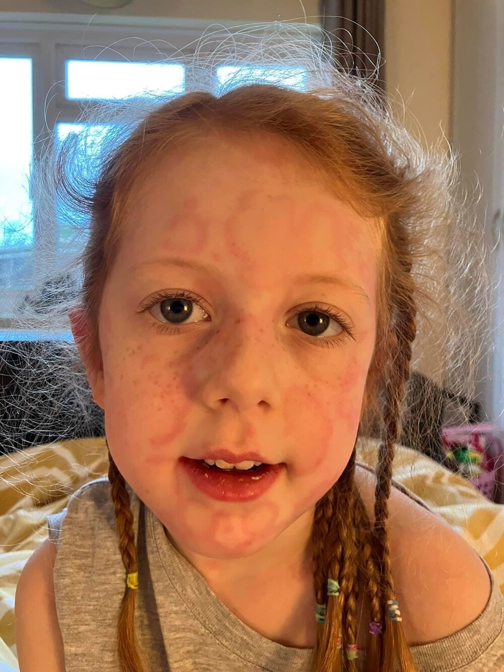“I woke up at 3 a.m. when Lily felt hot next to me. I turned on the light and almost screamed. She was covered in a strange rash literally from head to toe. The next day her ankle hurt and she couldn’t walk,” says mother Jenna Hunt.