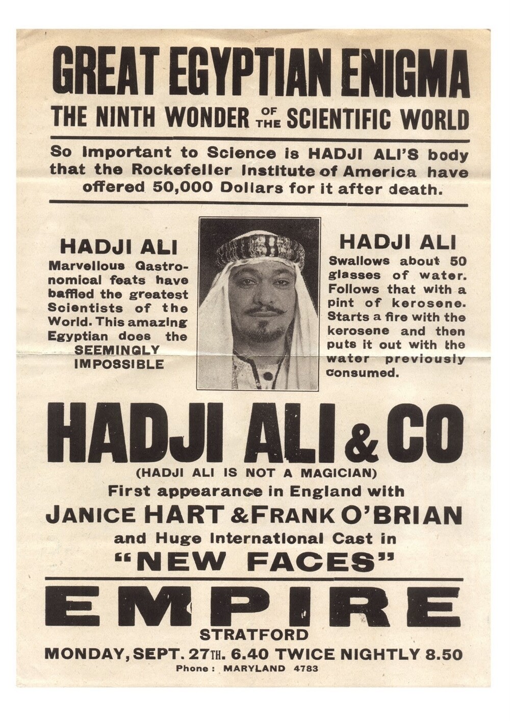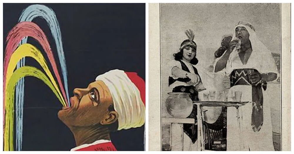 The Great Belcher, also called the Egyptian Mystery, was born in Egypt in 1892. In the 1920s, Haji Ali became something of an American vaudeville sensation due to his unusual ability to swallow various objects and vomit them back out in a manner that suited the audience's demands. Another signature number was the so-called human fountain.