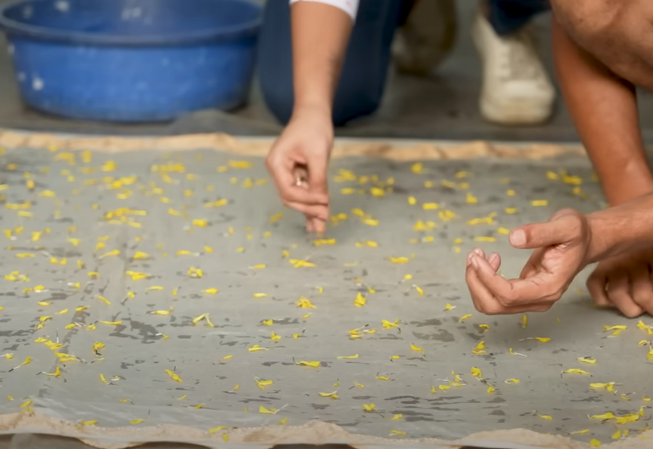 In factories, the petals are manually separated and then left to dry on racks for a couple of days. Then the fabrics are soaked in a special composition, and colored dried petals are laid out on a warm, damp cloth.