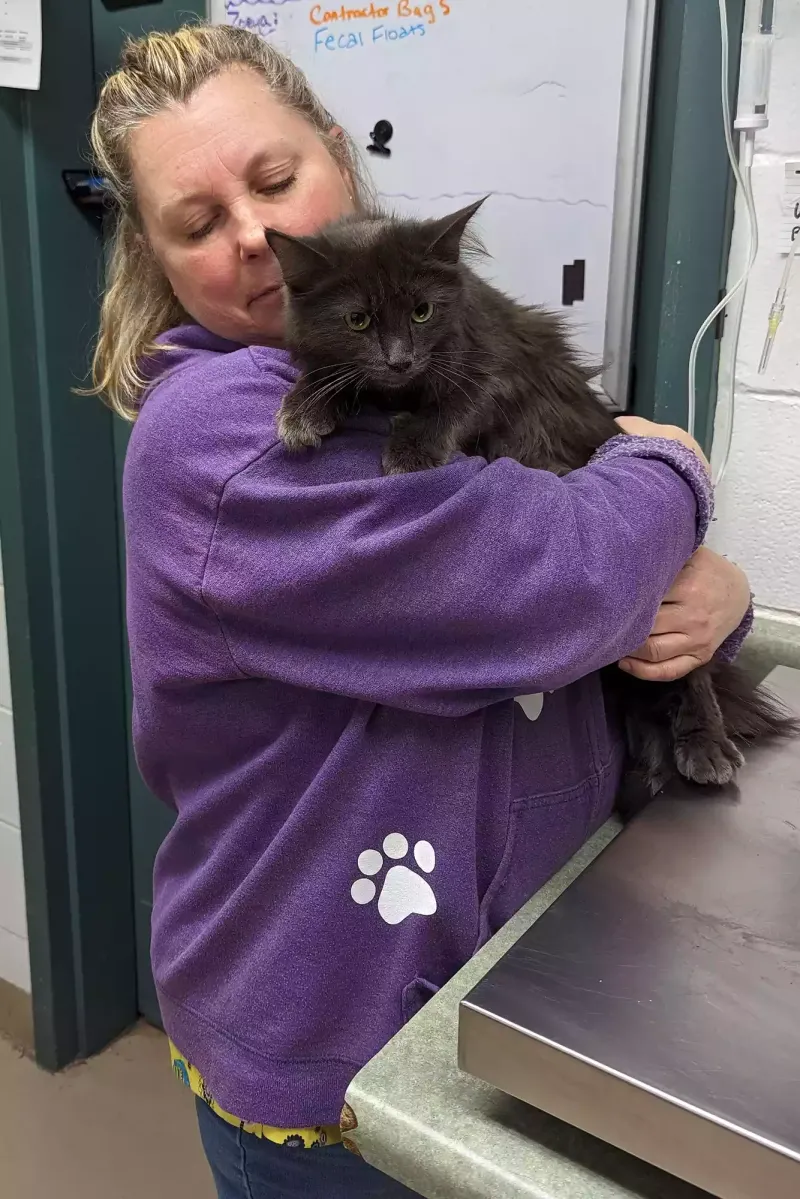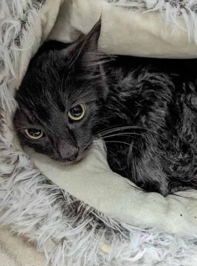 "She was abandoned in the pouring rain, tied in a pillowcase, on the side of the road near the turnoff to the lake. Luckily, a woman driving by saw that the pillowcase was moving and stopped to investigate. She untied the pillowcase, the cat ran out and immediately climbed into the engine of her car," shelter employees said.