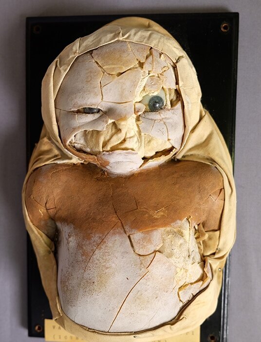 This exhibit dates back to the early 19th century and represents the wax head of a child, Germany. The mannequin was kept face down in a heated attic for many years, causing its facial features to flatten into a snout. Please enjoy.