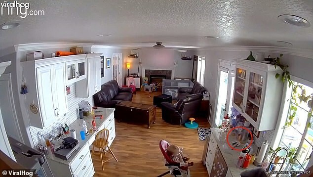 The footage shows the boy walking around the room while his little sister sits in a high chair in the kitchen. Then a bang is heard, and sparks begin to fly from the tabletop towards the girl.