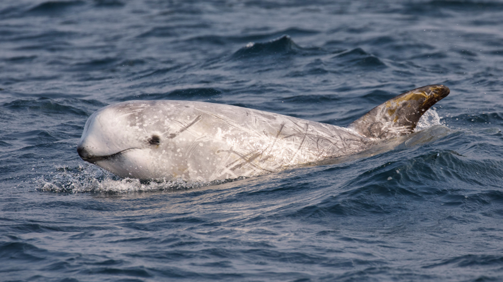 He may have been an orphan or an outcast, which partly explains his unusual behavior. He was the only Risso (gray dolphin) in the area.
